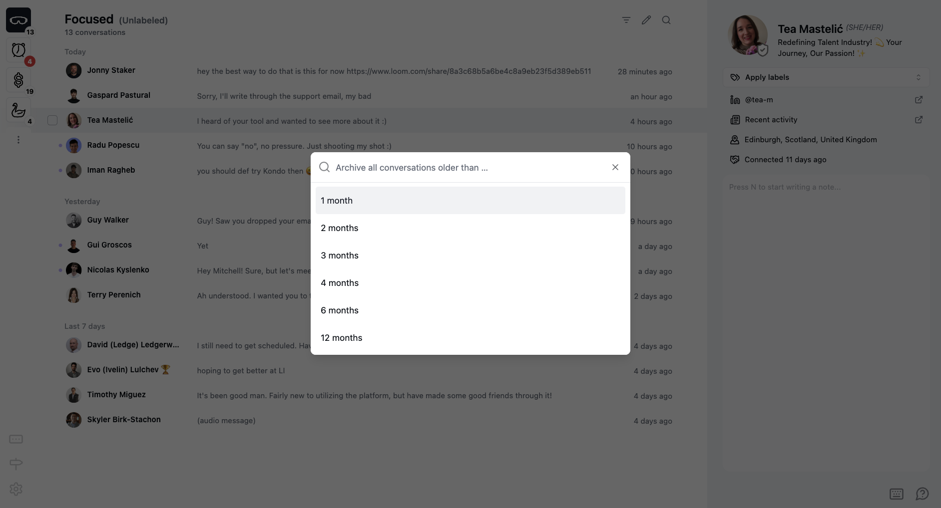 Select a time window, and Kondo will bulk archive all conversations older than that date