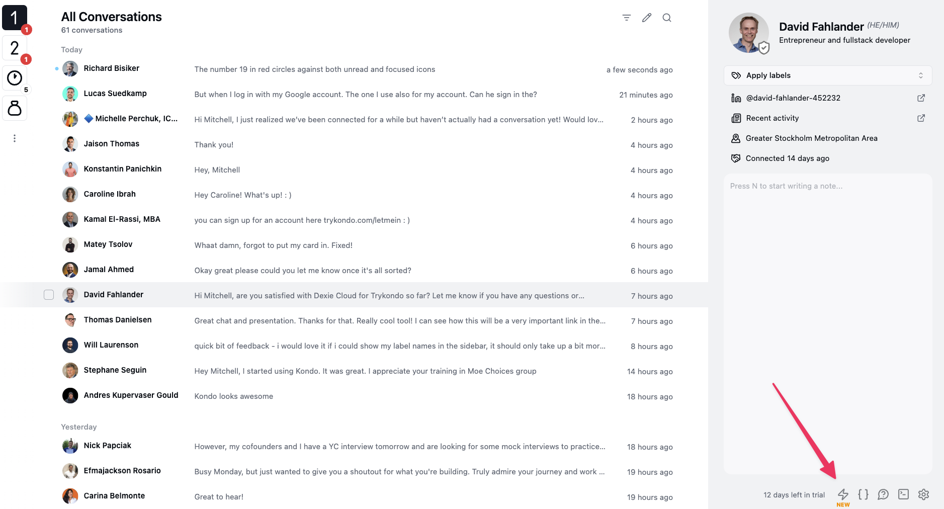 Go to app.trykondo.com/webhooks/new or click the ⚡ in the bottom right menu in the app and paste in the URL, then click “test then save”